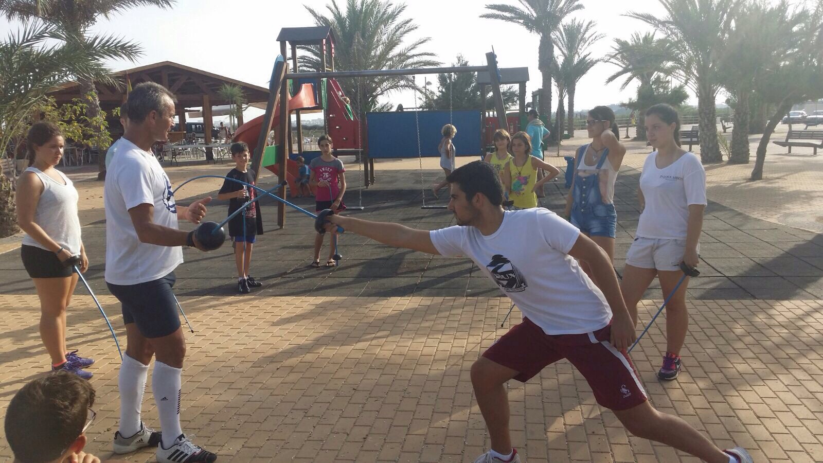 Al día siguiente, llegaba la hora de la verdad. Como en años anteriores, el domingo quedaba marcado por el Torneo de Esgrima El Mojón, en la modalidad de espada practicada en los talleres, con la participación de esgrimistas ya experimentados que se desplazan hasta El Mojón para la fecha, y que aprovechan para disfrutar de la esgrima en un entorno muy veraniego, a la sombra de las palmeras del paseo.